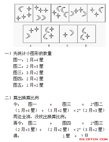 在公务员行测试题中,经常会考到的一类图形推理—— 小图形换算,而这类题目往往令广大考生比较头疼。因为在这类问题中我们必须解决两个问题,第一是广大考生怎么能一眼就知道这道题目是考察换算的呢;第二就是如何通过计算来确定换算关系。为了解决这两个问题,中公教育专家现带着大家共同来分析一下这类题目。首先我们来看看一道试题的解析: