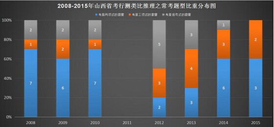 从上图当中,我们可以直观地看出近八年山西省公务员考试类比推理这部分考查的三种题型数量上的变化情况。除了2011年,其他七个年份均有所涉及,大多数年份通常会考查10道题,有且仅有2015年考查了5道题。从题型上看,最近2012-2015年对于填空式题型的考查越来越趋向弱化,呈逐年减少的趋势;三项式题型的考查所占比重比较稳定,在30%-40%左右;而两项式的题型所占比重由上升的势头。总体上难度系数趋于下降。