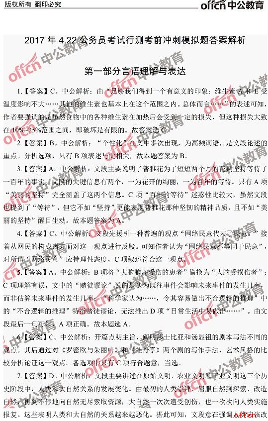 以下为山西中公教育提供2017山西省公务员考试行测模拟试题答案,供广大参与省考的考生参考,预祝大家在4.22考试中发挥出自己的实力,取得自己满意的成绩!
