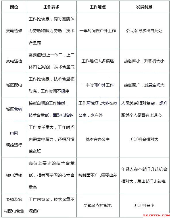 一般来说,国家电网公司主要有这几个岗位:变电检修,变电运检,城区配电,城区营销,电网调控运行,输电运输,乡镇及农村配电营业。很多想要报考国家电网的小伙伴们到现在还不知道国家电网内部的一些岗位职责等情况,不知道如何进行选择。下面小编为大家在网络搜集了国家电网各岗位的基本情况,让大家了解一下国家电网公司岗位到底都是干嘛的,方便大家网申时考虑,内容来源于网络,如有错漏,敬请原谅。