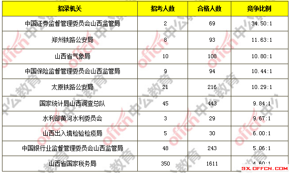 截至11月1日16时,据山西中公教育统计,国考职位中工作地点在山西的职位通过审核总人数为3009人,和去年同期相比合格人数减少了309人,截止目前共有44个职位无人报考,平均竞争比例为5.67:1,和去年同期竞争比基本持平。