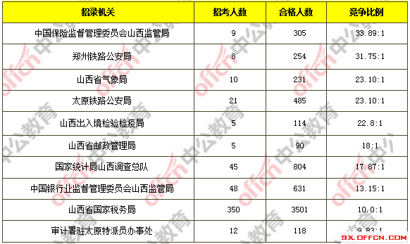 为帮助广大考生更清晰的了解今日报名情况,山西中公教育整理了审核通过人数前十位的部门以及竞争比例最激烈的十大部门,供广大考生参考: