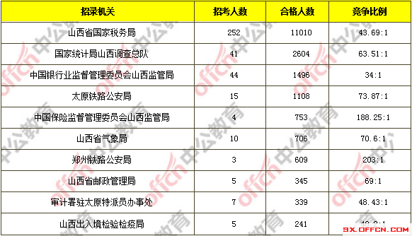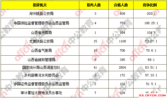 为帮助广大考生更清晰的了解今日报名情况,山西中公教育整理了审核通过人数前十位的部门以及竞争比例最激烈的十大部门,供广大考生参考:
