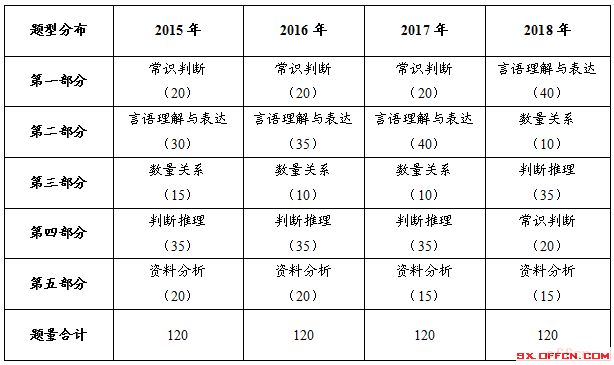 2015-2018年山西省考《行政职业能力测验》题型题量统计