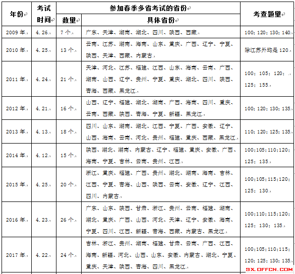 这10年参加过联考的省份,大体分为三类。第一类为稳定省份,最典型的比如湖南、湖北两省,不但每年都参加,而且题目也保持联考特点,不独立命题。第二类为不稳定省份,典型的比如天津、浙江等省市,有些年份参加,有些年份不参加,进进出出,参加的时候和联考题目大部分一致。第三类是联考独立命题类,典型的比如山东、吉林、陕西等省,即使同一天考试,但也非常鲜明的保持着本省的特点。