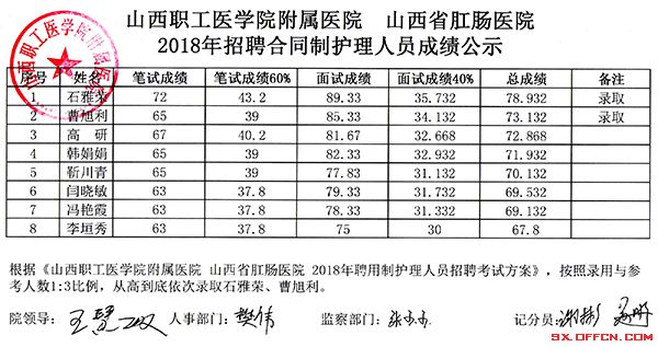 根据《山西职工医学院附属医院 山西省肛肠医院2018年聘用制护理人员招聘考试方案》,经报名资格审核、笔试、面试等环节,按照总成绩从高到底依次录取石雅荣、曹旭利,现于公示接受监督。