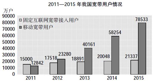 1.与2011年相比,2015年固定互联网宽带接入用户增加约为: