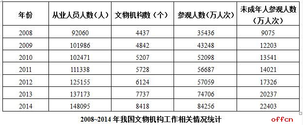 2014年全国文物机构共安排基本陈列9996个,比上年增长19.1%;举办临时展览11174个,增长15.8%;接待观众84256万人次,增长12.8%,其中博物馆接待观众71774万人次,占文物机构接待观众总人次的85.2%。
