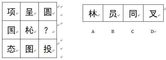 【中公解析】答案:B。图形当中,横向考虑,每一行的汉字均为“左右”、“上下”、“全包围”三种结构,第二行已出现“左右”与“全包围”结构,故答案应选择“上下”结构的B选项。